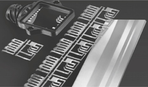 Depending on the requirements of the assembly technology for the final product, i.e. using connectors or soldering attachment, the clad strips are coated in the terminal area with a suitable surface layer with either an electroplated hard gold (AuCo0.3) layer or selectively by electroplating or hot dip tinning with pure tin or a tin alloy. To ensure the best bond properties during the coating process, the AlSi surface is protected against corrosion by masking during this processing step. | Depending on the requirements of the assembly technology for the final product, i.e. using connectors or soldering attachment, the clad strips are coated in the terminal area with a suitable surface layer with either an electroplated hard gold (AuCo0.3) layer or selectively by electroplating or hot dip tinning with pure tin or a tin alloy. To ensure the best bond properties during the coating process, the AlSi surface is protected against corrosion by masking during this processing step. | ||