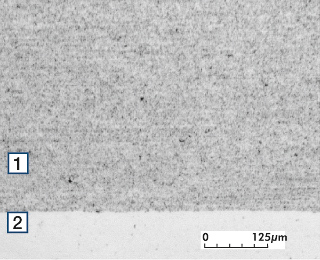 Ag/SnO2 88/12 WPD: parallel to extrusion direction 1) AgSnO2 contact layer, 2) Ag backing layer |